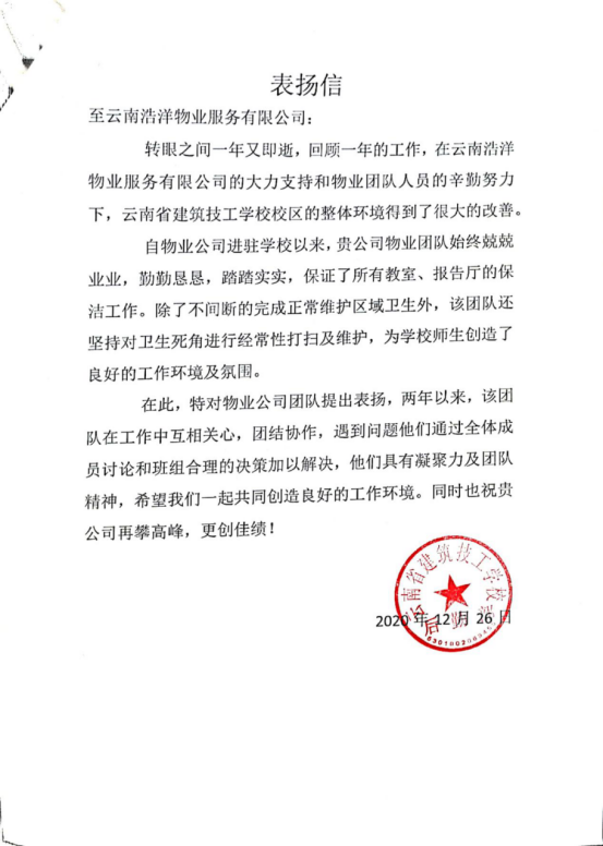 近日,云南浩洋物業(yè)“云南省建筑技工學(xué)校”物業(yè)服務(wù)中心,收到了一封來自于甲方業(yè)主的表揚信。信中表示,在云南浩洋物業(yè)服務(wù)團(tuán)隊兢兢業(yè)業(yè)、勤勤懇懇、踏踏實實的努力下,云南省建筑技工學(xué)校的校區(qū)整體環(huán)境得到了很大的改善,為學(xué)校師生創(chuàng)造了良好的工作環(huán)境及氛圍。